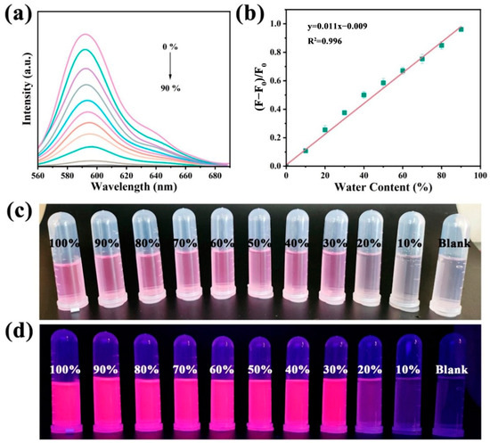 (a) Fluorescence emission curve of R-GQDs detecting water content in ethanol; (b) fitting curve and image of R-GQDs during moisture content detection; (c) sunlight; (d) fluorescence.