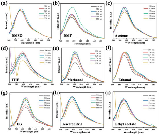 (a) Fluorescence spectra of R-GQDs in (a) DMSO; (b) DMF; (c) acetone; (d) THF; (e) methanol; (f) ethanol; (g) EG; (h) acetonitrile; (i) ethyl acetate.