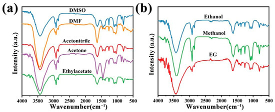 FT-IR spectra of freeze-dried or vacuum-dried graphene quantum dots dispersed in aprotic solvents (a) and protic solvents (b).