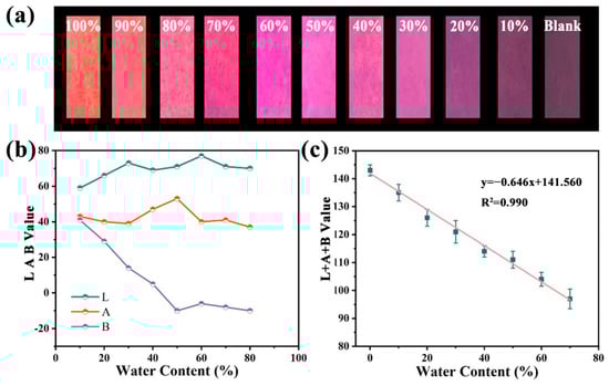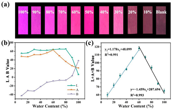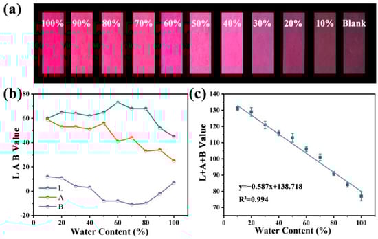 (a) Images of test strips with different water contents taken under 365 nm UV light; (b) trends of L, A and B values of R-GQDs test strips with changing water content; (c) linear relationship between the sum of L, A and B values and water content.