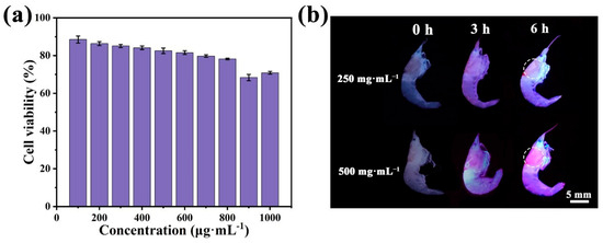 The bioimaging capability of R-GQDs has been evaluated using in vivo imaging in small animal models. Prior to this application, MTT assays conducted with 4T1 cells indicated that at a concentration of 1000 μg·mL−1, cell viability remained above 70% after 24 h of incubation (Figure 12a). This demonstrates that the R-GQDs synthesized in this study exhibit low biotoxicity within the concentration range of 0–1000 μg·mL−1. Additionally, the potential of R-GQDs for in vivo imaging was explored by treating black tiger shrimp with R-GQDs. Juvenile shrimp were incubated in dispersions of R-GQDs at concentrations of 250 mg·mL−1 and 1000 mg·mL−1 for varying durations (0, 3, and 6 h). Following irradiation with a 365 nm UV lamp, images were captured using a smartphone (Figure 12b). Notably, as the incubation time increased, R-GQDs gradually accumulated in the visceral region while preserving the shrimp’s external morphology and mobility. These findings indicate that R-GQDs possess good biocompatibility and safety, suggesting their potential as fluorescent imaging probes for in vivo applications.