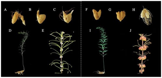 Phenotypic characteristics of different P. kingianum germplasms from different growth years. (A–C) One-to-three-year-old PW (Polygonatum kingianum ‘Linyun 1′); (D) plants of PW; (E) flowers of PW; (F–H) one-to-three-year-old PR (Polygonatum kingianum); (I) plants of PR; and (J) flowers of PR.