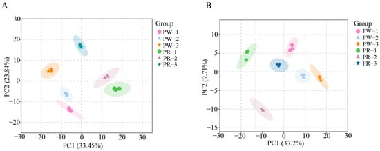 Principal component analysis (PCA) and orthogonal partial least squares discriminant analysis (OPLS-DA) between PWR and PRR samples from different growth years. (A) PCA diagram and (B) OPLS-DA diagram.