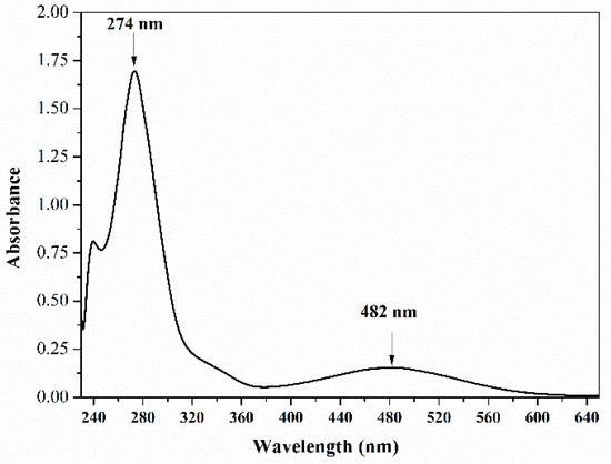 Figure 1 presents a typical UV-vis absorption spectrum of lapachol in PBS at pH 7.0. Two prominent absorption bands exist, centered at around 280 and 480 nm, in the UV and visible range, respectively. This spectrum profile agrees with the observed electronic spectra of substituted naphthoquinones, in which a strong π → π* transition of the quinone ring is expected at around 277 nm and a low-intensity band, in the 400 to 500 nm, can be assigned to the n → π* transition of the quinone carbonyls [33,34].