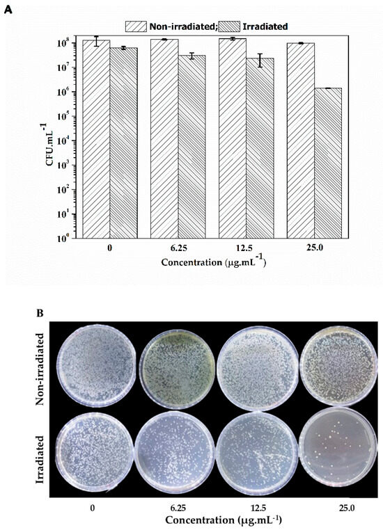 Figure 4 shows representative images of S. aureus colonies (strains ATCC and mcr-1) subjected to lapachol at 0.0, 6.5, 12.5, and 25.0 µg·mL−1 when kept in the dark (non-irradiated) and illuminated by blue light (450 nm) at an energy dose of 100 J·cm−2 for 60 min. Lapachol can effectively inactivate S. aureus using concentrations over 12.5 µg·mL−1. The data also revealed that lapachol alone could not inhibit the development of the non-irradiated colonies.