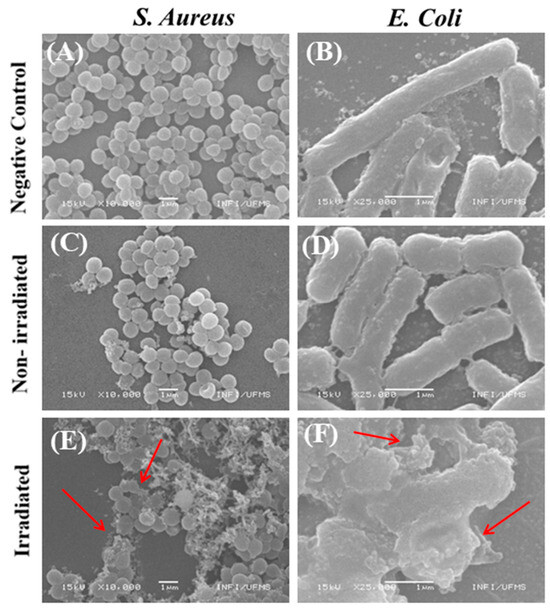 Representative SEM images of S. aureus and E. coli, respectively, subjected to the (A,B) negative control, lapachol at 25 µg·mL−1 kept in the dark; (C,D) non-irradiated group; and irradiated (E,F) with a blue light (450 nm) at 28 mW cm−2 during 60 min for S. aureus and 90 min for E. coli. Red arrows indicate partial or complete damage to the cell wall. All scale bars represent a length of 1 µm.