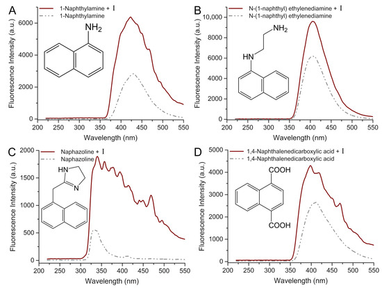 Comparison of fluorescence spectra with and without I (λex = 205 nm) induced by 1-naphthylamine (A), N-(1-nphthyl)ethylenediamine (B), naphazoline (C), and 1,4-naphthalenedicarboxylic acid (D) in methanol.