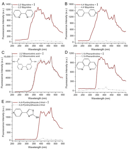 Comparison of fluorescence spectra with and without I (λex = 205 nm) induced by 2,2′-bipyridine (A), 4,4′-bipyridine (B), 2,2′-biisonicotinic acid (C), 1,10-phenanthroline (D), and 4-(4-pyridinyl)thiazole-2-thiol (E) in methanol.