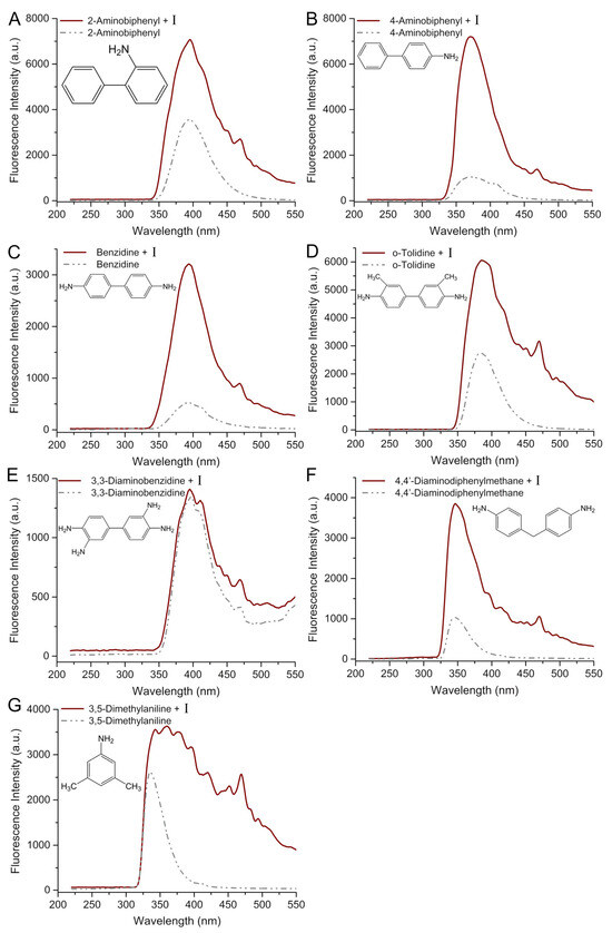 Comparison of fluorescence spectra with and without I (λex = 205 nm) induced by 2-aminobiphenyl (A), 4-aminobiphenyl (B), benzidine (C), o-tolidine (D), 3,3-diaminobenzidine (E), 4,4-diaminodiphenylmethane (F), and 3,5-dimethylaniline (G) in methanol.