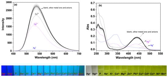 In the ethanol solution of P, 100 μM of various metal ions (Na+, K+, Ag+, Ca2+, Mg2+, Zn2+, Pb2+, Cu2+, Hg2+, Cd2+, Co2+, Ni2+, Mn2+) and anions (I−, NO3−, Cl−, Ac−, ClO4−, Br−, H2PO4−, HPO42−, CO32−, SO42−) was added. The fluorescence and UV-vis spectra of the system were recorded (Figure 1). As shown in Figure 1a, P exhibited strong fluorescence at 537 nm. Upon the addition of Ag+, the fluorescence at 537 nm was completely quenched, achieving a quenching rate of 100%. Although the introduction of Hg2+ also led to a decrease in the fluorescence intensity of P, the quenching rate was only 47%, and a significant fluorescence emission remained. The addition of other metal ions and anions did not result in any noticeable reduction in fluorescence, indicating that P demonstrated excellent selectivity for Ag+ in ethanol. In Figure 1b, prior to the addition of ions, P displayed a characteristic absorption peak of naphthalimide at 440 nm. The introduction of Hg2+ caused a reduction in absorbance at 440 nm, along with a weak absorption observed near 340 nm. Following the addition of 100 μM of Ag+, the absorption peak of P at 440 nm disappeared, while a strong absorption peak emerged around 340 nm, confirming that P possessed a good selectivity for Ag+. Moreover, the colorimetric tubes containing blanks and various added ions all exhibited a yellow color, but only the addition of Ag+ caused the P solution to turn colorless, which can be attributed to the specific quenching effect of Ag+ on P. The photographs displaying the solution of P in both the absence and presence of metal ions under ambient light and UV-vis light are presented in Figure 1. These images effectively demonstrated the potential for practical applications in the naked-eye detection of these analytes.