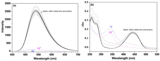 Interestingly, when the test medium was adjusted to an ethanol–water solution (v:v, 9:1, pH 7.0, 20 mM HEPES), and the order of reagent addition was changed through adding P first and then the tested ions, the fluorescence and UV-vis detection results were shown in Figure 2. As seen in Figure 2a, the addition of 100 μM Ag+ or Hg2+ resulted in a significant quenching of the fluorescence intensity of P at 537 nm, with a quenching rate approaching 100%. In contrast, under the same conditions, the addition of other metal ions and anions to the P solution did not cause any noticeable changes in the fluorescence spectrum. This indicated that P can selectively recognize both Ag+ and Hg2+. Furthermore, as illustrated in Figure 2b, only Ag+ and Hg2+ caused a substantial decrease in the absorbance of the characteristic naphthalimide peak at 440 nm, accompanied by the emergence of a new absorption band near 340 nm.