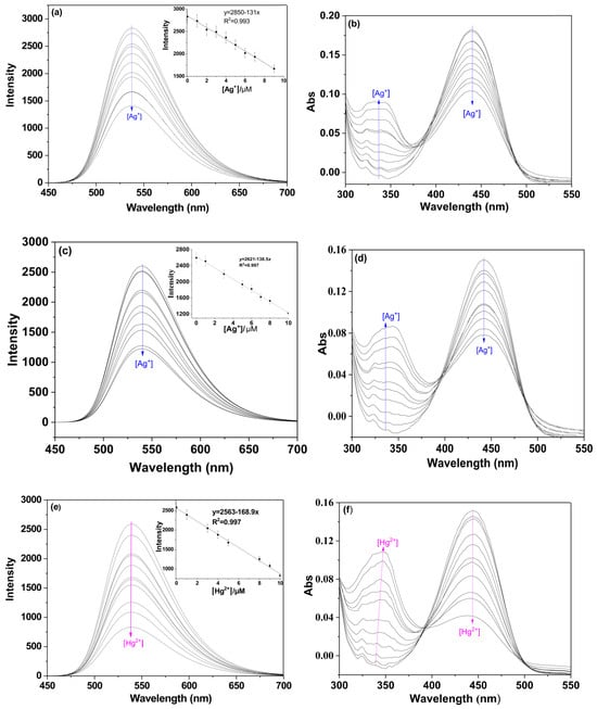 In an ethanol–water solution (v:v, 9:1, pH 7.0, 20 mM HEPES), fluorescence spectra of P containing different concentrations (0, 1, 2, 3, 4, 5, 6, 7, 8, 9, 10 μM) of Ag+ or Hg2+ were measured and were shown in Figure 3c,e, respectively. The spectral results revealed that the fluorescence intensity at 537 nm of the solution decreased with the increase in the Ag+ or Hg2+ concentration. The fluorescence intensity of the solution had a good linear relationship with Ag+ concentration (1–10 μM), and the linear correlation equation could be described as y = 2621 − 138.5x, with the correlation coefficient R2 = 0.997. The NaCl-adding experiments were conducted to examine the reversibility of the P. As clearly shown in Figure S2, the fluorescence intensity at 537 nm remained unaffected when NaCl was added to the solution containing P and Ag+, which indicated that P can irreversibly coordinate with Ag+. Similarly, the good linear relationship between the fluorescence intensity of the solution and Hg2+ concentration (1–10 μM) could be described by the equation y = 2563 − 168.9x, with the correlation coefficient R2 = 0.993, and the minimum limit of detection (LOD) of P for Ag+ and Hg2+ ions was calculated to be 0.33 μM, respectively. The Na2S-adding experiments were conducted to examine the reversibility between P and Hg2+ shown in Figure S3; the fluorescence intensity at 537 nm increased when Na2S was added to the solution containing P and Hg2+. In addition, the color also changed from colorless to yellow. When Hg2+ was added to the system again, the signal was almost completely reproduced, and the yellow solution turned to colorless. These findings indicated that P can reversibly coordinate with Hg2+. It was speculated that the coordination of Ag+ or Hg2+ with P triggered a reverse photo-induced electron transfer (PET) process, resulting in fluorescence quenching. As shown in Figure 3d,f, the trend observed in the UV-vis spectra with increasing concentrations of Ag+ or Hg2+ mirrored the changes observed when P detected Ag+ in ethanol (Figure 3b).