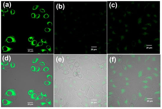 Hela cells fluorescence images. (a) Cells cultured with 10 µM of P for 30 min in the growth medium; (b) cells cultured with 10 µM of P for 30 min in the growth medium and then supplemented with 8 μM Ag+ for 30 min; (c) cells cultured with 10 µM of P for 30 min in the growth medium and then supplemented with 8 μM Hg2+ for 30 min; (d) image of bright field cells in panel (a); (e) image of bright field cells in panel (b); (f) image of bright field cells in panel (c).