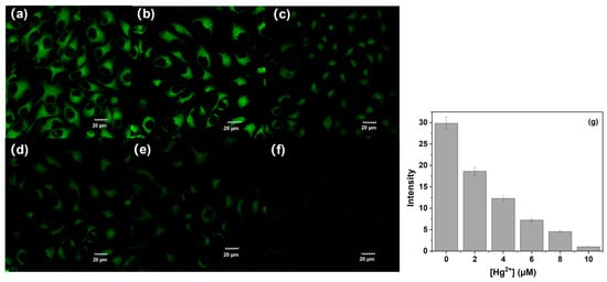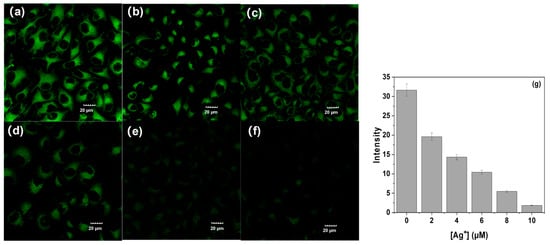 Additionally, fluorescence imaging of probe P (10 μM) in HeLa cells was performed with varying concentrations of Ag+ and Hg2+ (0, 2, 4, 6, 8, 10 μM). The results revealed a consistent reduction in fluorescence intensity with increasing concentrations of Ag+ and Hg2+, as shown in Figure 5a–f and Figure 6a–f. This trend was quantitatively validated through the measurement of average fluorescence intensity using confocal laser scanning microscopy, as illustrated in Figure 5g and Figure 6g. These results confirmed that probe P can effectively respond to changes in intracellular levels of Ag+ and Hg2+ in living cells.