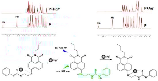 Top: The 1H NMR comparison of P with P-Ag+ and P-Hg2+. Bottom: Proposed recognition mechanism of P with Ag+ and Hg2+.