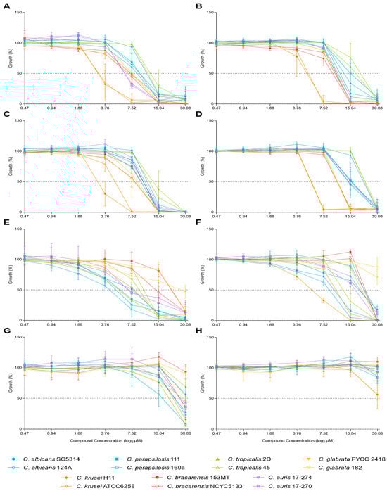 Effect of C34, C35, A44, and A42 concentrations on the growth of fourteen strains of seven species of Candida after 24 h (left) and 48 h (right) of incubation. (A,B)—C34; (C,D)—C35; (E,F)—A44; (G,H)—A42.