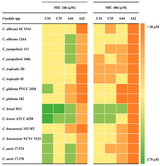 After 24 h of incubation and considering all Candida species tested, the MIC values were very similar for C34 and C35. For these compounds, the values obtained ranged from 3.75 to 15 µM, with MIC geometric means of 10.1 µM and 12.9 µM, respectively. For A44, although the MIC values ranged from 7.5 µM to 30 µM, the MIC geometric mean was very close to that of C35, with 12.3 µM. On the other hand, A42 displayed the highest MIC values, indicating that the simultaneous addition of a julolidine moiety and a chloropropyl group, did not contribute to an enhancement of the anti-Candida activity (Figure 2 and Table 2).