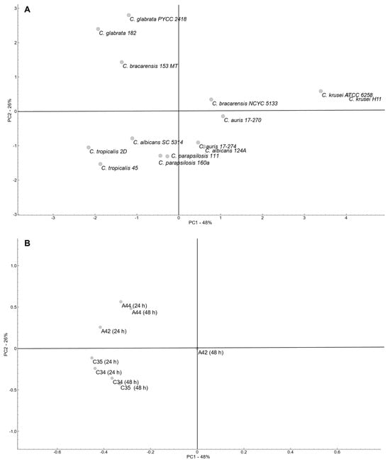 Principal component analysis (PCA) of MICs data from fourteen strains of Candida spp. (A)—Scores: 14 strains segregation. (B)—Loadings: benzo[a]phenoxazine derivatives and timepoints tested.