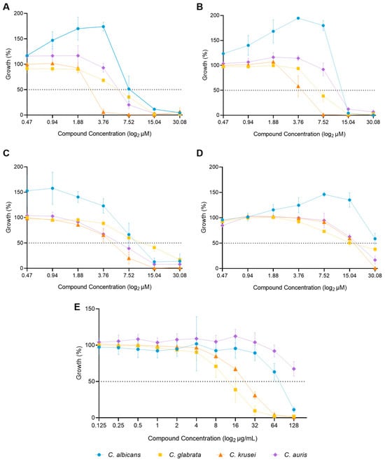 Effect of the concentration of the selected compounds and fluconazole on the growth of four Candida species (C. albicans, C. glabrata, C. krusei and C. auris). (A)—C34; (B)—C35; (C)—A44; (D)—A42; (E)—Fluconazole.