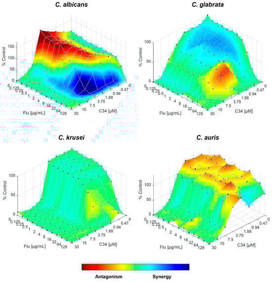Regarding the combination of fluconazole and C34, the FICI indicated an indifferent interaction for C. albicans, but the RSM analysis revealed a more complex interaction pattern. While the overall interaction might be indifferent, there are specific concentration ranges in which the drugs interact synergistically or antagonistically, as shown by the areas of blue and red on Figure 5, respectively. For C. glabrata, for which FICI showed an antagonistic interaction, the RSM analysis demonstrated that antagonism occurs at specific concentrations, but its effect is not uniform across all concentrations, and there are even regions of weak synergism. For C. krusei, both approaches indicated indifference, and for C. auris, although the overall interaction is indifferent, there are isolated concentrations where antagonism might occur (Figure 5).