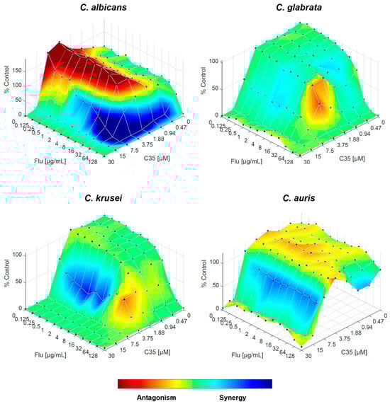 When combining fluconazole with C35, the effect on C. albicans was highly similar to the combination with C34; however, despite the FICI suggesting an indifferent interaction, the actual interaction appears more complex. For C. glabrata, the indifferent interaction observed with FICI is established, although there might be minor antagonistic effects. For C. auris, the scenario is inverted: while the overall interaction remains indifferent, some drug concentration ranges begin to interact synergistically, and antagonistic effects are less prominent. Finally, the synergistic interaction observed for C. krusei is supported by this approach (Figure 6).