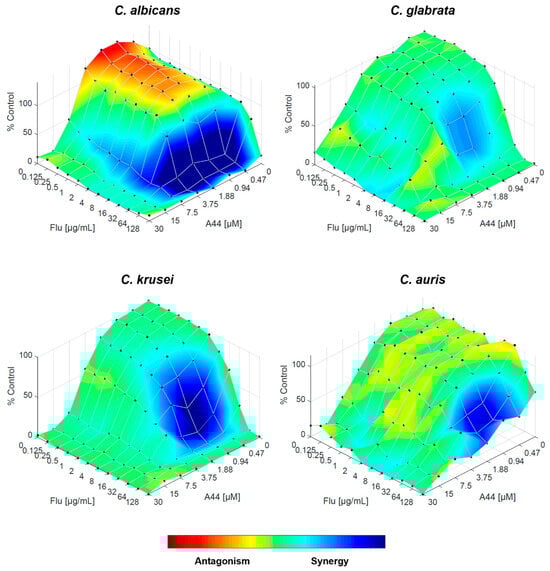 Combination of A44 and fluconazole against C. albicans, C. glabrata, C. krusei and C. auris, analysed by response surface modelling based on the Bliss model. Synergy is mapped on the experimental response surface.