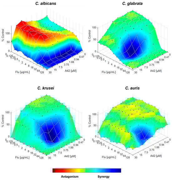 Combination of A42 and fluconazole against C. albicans, C. glabrata, C. krusei and C. auris, analysed by response surface modelling based on the Bliss model. Synergy is mapped on the experimental response surface.