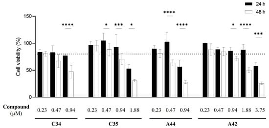 Effect of increasing concentrations of each benzo[a]phenoxazine (C34, C35, A44 and A42) on the viability of J774A.1 cells. Viability was assessed using the MTT assay after 24 h (black bars) and 48 h (white bars) of incubation. The results indicate the mean ± SD of three independent assays. Significant differences between the two time points of incubation, 24 h and 48 h, are represented by * p < 0.05, *** p < 0.001, **** p < 0.0001.