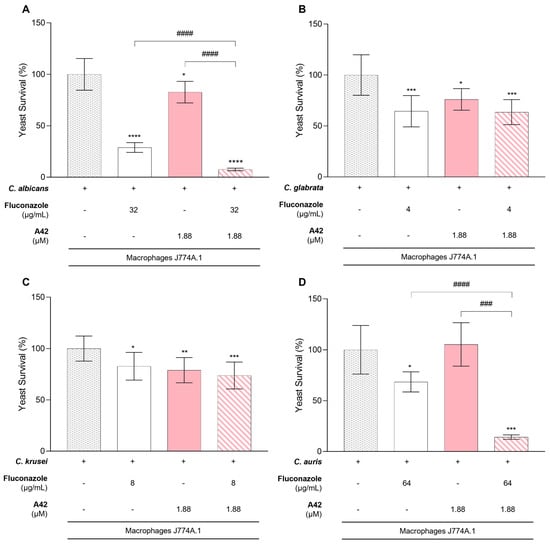 Results of macrophage killing assay using the cellular line J774A.1 and four fluconazole-resistant Candida species. (A)—C. albicans; (B)—C. glabrata; (C)—C. krusei; (D)—C. auris. These graphics compare the yeast survival after incubation with macrophages, macrophages with fluconazole or A42 (alone) and macrophages with the combination of both drugs to evaluate the synergistic effect. The results indicate the mean ± SD of two independent assays. Significant differences with Candida cells incubated with macrophages are represented by * p < 0.05, ** p < 0.01, *** p < 0.001, **** p < 0.0001. Significant differences between the single-drug effects and the effects of the multi-drug combinations are represented by ### p < 0.001, #### p < 0.0001.
