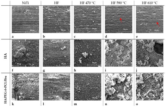 SEM microimages (100 × 100 µm2) for (a) untreated NiTi; (b) etched in HF/HNO3/H2O; (c) heated at 470 °C; (d) heated at 590 °C; (e) heated at 610 °C; (f) hydroxyapatite layer (HA) on NiTi; (g) HA on etched nitinol; (h) HA on NiTi heated at 470 °C; (i) HA on NiTi heated at 590 °C; (j) HA on NiTi heated at 610 °C; (k) HA/PEG-b-PCL/ibuprofen on untreated NiTi; (l) HA/PEG-b-PCL/ibuprofen on etched NiTi; (m) HA/PEG-b-PCL/ibuprofen on NiTi annealed at 470 °C; (n) HA/PEG-b-PCL/ibuprofen on NiTi annealed at 590 °C; (o) HA/PEG-b-PCL/ibuprofen on NiTi annealed at 610 °C. Red arrows indicate the porous structure of TiO2..