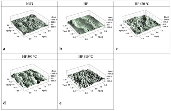 AFM microimages (5 × 5 µm2) for (a) untreated NiTi; (b) etched in HF/HNO3/H2O solution (abbrev. HF); (c) etched in HF/HNO3/H2O solution and heated at 470 °C for 30 min (HF 470); (d) etched and heated at 590 °C (HF 590); (e) etched and heated at 610 °C (HF 610).