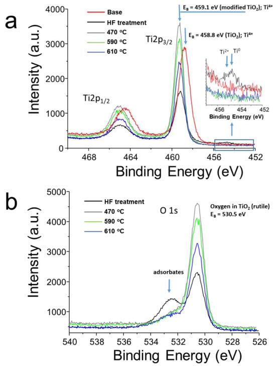 In Figure 3a, the collection of the measured Ti2p core lines for all samples has been shown. The peak position of the Ti2p3/2 core line for the base sample equals 458.8 eV and is related to the presence of atoms in the TiO2 layer, while the modification of the surface by chemical treatment and following elevated heating causes shifts of the other spectra toward higher binding energy of about 0.3 eV. It can indicate the inhomogeneous distribution of titanium oxide on the surface and incomplete oxidation of the tested wires, as indicated by the presence of Ti2+ electronic states or Ti0 titanium metal. The shape of the O1s spectra has been presented in Figure 3b. All peaks are located at a binding energy of 530.5 eV and indicate the modified surface of the suggested TiO2 layer after chemical and temperature treatments of study wires in relation to clean titanium dioxide. An additional bump marked by arrows indicates additional components presented in the shape of the O1s line, which can be related to adsorbates. The influence of chemical treatment and the annealing process at different temperatures clearly changes the intensity of the core levels. The sequence of intensity changes is identical in both cases of studied lines Ti2p and O1s. The lowest intensities of Ti2p3/2 and O1s peaks are observed in the base and the acid-etched samples. The annealing process at 470 °C leads to an increase in their intensities, while subsequent annealing steps at 590 °C and 610 °C led to a gradual decrease. Additionally, for the Ti2p3/2 line, successive annealing steps remove Ti2+ and Ti0 electronic states from the surface of the tested materials, as shown in the enlarged inset in Figure 3a. The annealing process does not significantly influence the shape of the Ti2p doublet. In the case of the O1s line, an additional feature is observed at higher binding energy for the chemically etched samples at room temperature conditions (RT conditions), which can be attributed to the presence of adsorbates on the surface. The intensity of these features significantly decreases during the annealing process at particular temperatures.