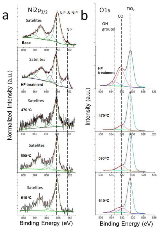 In Figure 5a, the ratios of calculated atomic concentration of Ti/O and Ni/O for each annealing step are shown. Initial chemical treatment contributes to a visible increase in the Ti/O ratio and a decrease in Ni/O. The first step of annealing under normal conditions for T = 470 °C results in a drastic increase in the Ti/O ratio and a decrease in Ni/O. The next temperatures of annealing at 590 °C and 610 °C resulted in a gentle decrease in Ti/O and a simultaneous increase in Ni/O. An annealing at 610 °C leads to a more significant decrease in Ti/O. A slightly greater Ti/O ratio after thermal heating was also observed by Chrzanowski et al. [50], where the Ti/O ratio increases from 0.31 to 0.35 (slightly lower than in our case). While that fact was not commented on, we assume that a slightly greater ratio of Ti/O and Ni/O after thermal heating at 470 °C corresponds to the composition of the rutile phase that is not observed for non-heated etched NiTi.