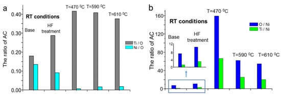 For all applied temperatures, decreasing Ti/Ni and O/Ni ratios can be observed, as shown in Figure 5b.