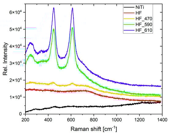 Raman spectra for (untreated NiTi; etched in HF/HNO3/H2O solution (abbrev. HF); etched in HF/HNO3/H2O solution and heated at 470 °C for 30 min (HF_470); etched and heated at 590 °C (HF_590); etched and heated at 610 °C (HF_610).