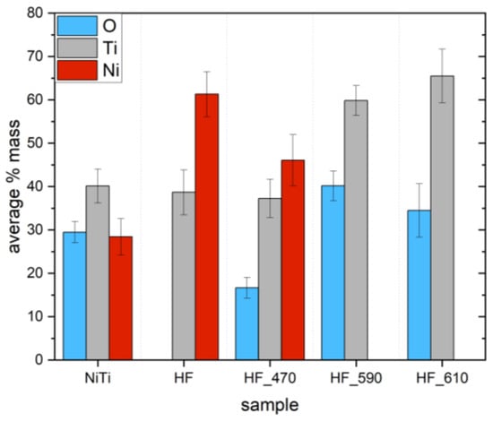 Element analysis was determined by the SEM-EDS method. Measurements were carried out in six points on the sample. The mass content for O, Ni, and Ti for untreated nitinol (NiTi) is shown in Figure 8. The presence of oxygen is determined by the light oxidation of nitinol by the manufacturer. The appearance of the native layer of nitinol (untreated) was dark. After chemical etching, the oxygen disappears from the surface, and the concentrations of Ni and Ti are 55 and 45% (mass), while the surface becomes light. Thermal heating leads to a gradual increase in oxygen content and a decrease in the ratio of Ti/Ni due to the increasing thickness of the TiO2 layer due to oxidation. For samples HF_590 and HF_610, Ni completely disappears. The basic difference between the composition obtained by XPS and EDS is determined by different penetration depths. XPS is a highly surface-sensitive technique limited to a maximum of 10 nm at the top of the surface in a vertical direction, while EDS is a rather bulky technique with a penetration depth of up to 1–2 µm.