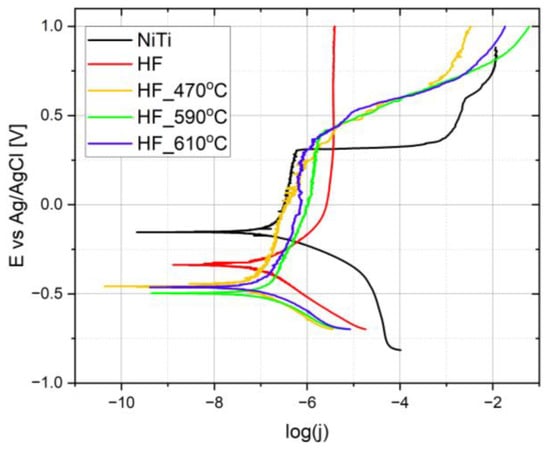 The dependence of OCP (open circuit potential) after immersing in PBS solution (before the determination polarization curve) is shown in Figure S3 (Supplementary Materials). Untreated and chemically etched nitinol exhibit similar OCP curves that gradually increase and finally reach a steady state after 570 s (dE/dT < 1 µV/s), while OCP potential for untreated NiTi is positively shifted of 0.2 V. It arises from the fact that untreated nitinol possesses thin TiO2 layer created during the manufacturing process. After thermally heating at 470 °C, the potential is shifted toward more negative values, and after about 100 s, it reaches a more stable value, while the assumed steady state limit (dE/dE < 1 µV/s) does not reach up to 1200 s. For samples HF_590 and HF_610, the starting potential is the most positive, which gradually shifted toward more negative values. It may arise from the porosity layer and higher content of nickel in the outermost part of the TiO2 layer.