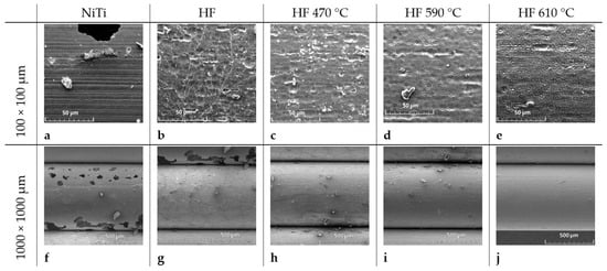 SEM microimages for (a,f) untreated NiTi; (b,g) etched in HF/HNO3/H2O solution (abbrev. HF); (c,h) etched in HF/HNO3/H2O solution and heated at 470 °C for 30 min (HF_470); (d,i) etched and heated at 590 °C (HF_590); (e,j) etched and heated at 610 °C (HF_610).