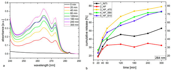 (a) UV-VIS curves for ibuprofen released from hybrid layer HA/PEG-b-PCL deposited on NiTi(untreated); (b) Cumulative release % of ibuprofen from HA/PEG-b-PCL deposited on HA/NiTi, HA/HF, HA/HF_470, HA/HF_590, and HA/HF_610.
