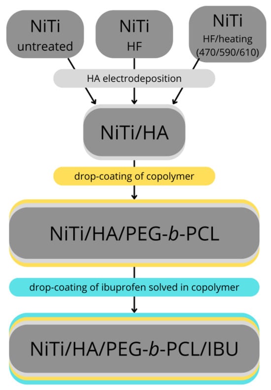 In this work, we examined the influence of heating of nitinol wire at 470, 590, and 610 °C under air conditions on morphology, chemistry of surface, and corrosion properties of NiTi. Subsequently, we studied the morphology of the hydroxyapatite layer electrodeposited by pulse current. Consequently, the morphology of bilayer PEG-b-PCL/ibuprofen deposited on hydroxyapatite by drop-coating was examined. Finally, the efficiency of ibuprofen released from PEG-b-PCL/ibuprofen was evaluated in the context of biomedical application. In the previous studies [23], nitinol wire was annealed at 470 °C under vacuum conditions. Due to this reason, we have chosen that temperature as the basis. We also evaluated nitinol samples annealed at 510 °C and 550 °C and examined them directly using the Raman method. No significantly stronger rutile peaks were observed in comparison to the sample treated at 470 °C. On the other hand, at higher temperatures of 590 °C and 610 °C, due to the formation of significantly thicker TiO2, significant rutile peaks were observed), and we decided to select these annealing temperatures (590 °C and 610°C) for further studies. It is worth emphasizing that the deposition of HA and subsequent PEG-b-PCL/ibuprofen bilayer on NiTi thermally treated at 590 and 610 °C has not been studied before.