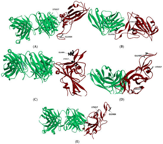 The structures of numerous antibody–spike complexes have been predominantly determined using Cryo-EM [5,7,8,9,10,11,12], providing critical insights into antibody–spike binding. The wealth of structural data has enabled the study of spike–antibody (Ab) complexes using computational methods [13,14,15,16]. Many of these studies have focused on predicting the affinities of a given VOC for a group of antibodies. Another study used an accelerated MD and Ab-initio hybrid MD calculations to identify the most predominant interactions at the atomic level under physiological conditions of the Wuhan (native) RBD with only two (Abs S309 and CR032 Abs, belonging to groups 3 and 4) [13]. Von Bulow et al. performed an extensive MD simulation on the spike trimer, including the glycans that surround it. The structures obtained from the MD trajectories were used to determine which regions of the trimer were sequestered by the sugar shield. They found a correlation between the accessibility to the spike residues and their mutation propensities [14]. Of special interest are attempts at finding algorithms that predict the binding of a given VOC to a set of Abs. Williams and Zhan generated a multi-layer perceptron (MLP) neural network which was used to predict the binding affinity of some of the reported Abs with various VOCs and it may be used in the future to predict binding to emerging Ab’s [15]. Others, such as Chen et al. elaborated a scoring function based on the results of Coarse Grain (CG) dynamics for a set of variants [16].
