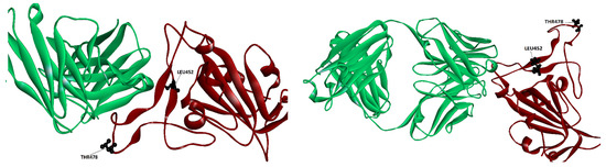 Location of the mutations that comprise the Delta VOC when the RBD spike is bound to class 2 Ab Ly-CoV555 (left panel) and when bound to class 3 Ab regn 10987 (right panel). Ab is colored in green and spike in brown.
