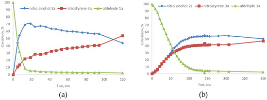 We previously demonstrated that the chiral copper(II) complex (S)-Cu1 catalyzes the Henry reaction of o-nitrobenzaldehyde 1a with nitromethane, producing the nitroalcohol 2a in 78% yield with 77% ee (Table 1, entry 1) [64]. On the other hand, when the temperature was increased to 50 °C, nitrostyrene 3a formed in 55% yield and the enantiomeric purity of 2a also dropped to 25% (Table 1, entry 2). To improve the yield, an additional quantity of acetate base was used, resulting in a significant increase in the yield of 2a to 96%, with an ee of 73% (Table 1, entry 4). When the reaction time was extended to 65 h, a similar yield of 92% was obtained, along with 7% of nitrostyrene being formed, but with a decrease in ee to 55% (Table 1, entry 5). This may be attributed to a partial racemization process.