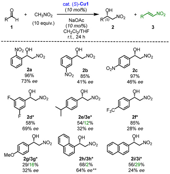 A flask (10 mL) was charged with aldehyde 1 (0.3 mmol, 1 equiv.), (S)-Cu1 catalyst (13.2 mg, 10 mol %), and NaOAc (2.4 mg, 10 mol %) under Ar atmosphere. Then, a solvent mixture of THF/DCM (0.25 mL/0.25 mL) and nitromethane (0.160 mL, 3 mmol, 10 equiv.) was added and the reaction mixture was stirred for 24 h at RT. After the reaction was complete, the reaction mixture was purified by flash SiO2 chromatography (eluent: CH2Cl2). The solvent was evaporated on a rotary evaporator, and the residue was purified by column SiO2 chromatography (eluent: hexane/acetone (5:1)) to afford the desired (S)-product 2.