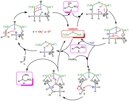 Finally, based on the experimental results and findings, we propose a mechanism for the catalysis (Scheme 5). The first step is the formation of a catalytically active dimeric complex from (S)-Cu2 and Ag2O, where two units of copper are linked by a μ2-oxygen bridge ([L-Cu]-O-[L-Cu]) [65]. This catalytic particle with a higher basicity of the oxygen bridge, promotes the reversible nitroaldol reaction, leading to the formation of nitroalcohol 2. Subsequently, the dehydration process is accelerated as the complex [L-Cu]-O-[L-Cu] appears to coordinate with product 2, increasing the acidity of its β-protons and activating the leaving hydroxyl groups of nitroalcohols by coordinating with the Cu ion, thus facilitating the E1cB elimination step for the production of β-nitrostyrene 3 (Scheme 5). This concept explains why strongly basic tBuOK promotes only the retro-aldol decomposition of nitroalcohols and not their dehydration. It should also be noted that the Michael addition reaction of the second nitromethane molecule leads to the formation of a minor bis-coupled product 4 [66].