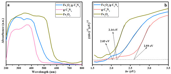 The optical absorption capability of the different samples was tested by UV–vis diffuse reflectance spectroscopy (DRS). It can be seen from Figure 4a that both g–C3N4 and Fe2O3 can absorb UV and visible light, and their light absorption edges are approximately 480 and 696 nm, respectively. The Fe2O3/g–C3N4 composite shows a significantly red-shift compared to pure g–C3N4, and the absorption intensity in both UV and visible light is enhanced.