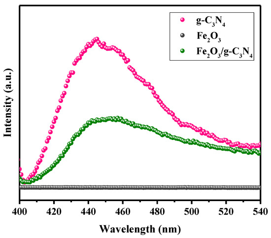 The separation efficiency and transfer behavior of photogenerated carriers can be investigated by photoluminescence (PL) spectra. In general, a reduced PL spectra signal is attributed to a decreased combination rate of photogenerated electron–hole carriers, bringing about an enhanced photocatalytic performance [35]. As shown in Figure 5, it is observed that the fluorescence signals of the Fe2O3/g–C3N4 composite are notably weaker than that of pure g–C3N4, indicating that Fe2O3 could capture the photogenerated electrons from g–C3N4, leading to effective improvements in photogenerated electron–hole pair separation. No prominent emission peak for Fe2O3 was observed in our work, which is consistent with other reports [25,35,36].