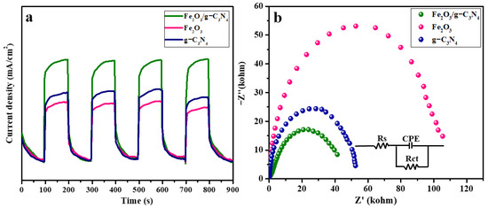 The migration and separation properties of the photogenerated carriers of g–C3N4, Fe2O3 and Fe2O3/g–C3N4 samples were further evaluated by transient photocurrent response (i–t) curves and impedance electrochemical spectroscopy (EIS). An intercept at a high-frequency area corresponds to the ohmic resistance (Rs) of the electrode and electrolyte, and a semicircle is ascribed to charge transfer resistance (Rct), while a straight line (CPE) is related to the ion diffusion at the electrode. As shown in Figure 6, Fe2O3/g–C3N4 exhibits a stronger photocurrent response and a smaller impedance arc radius relative to that of g–C3N4 and Fe2O3, indicating that the resistance to charge migration is greatly reduced, while the charge separation is effectively improved, by the construction of a heterojunction between Fe2O3 and g–C3N4, yielding excellent photocatalytic activity.