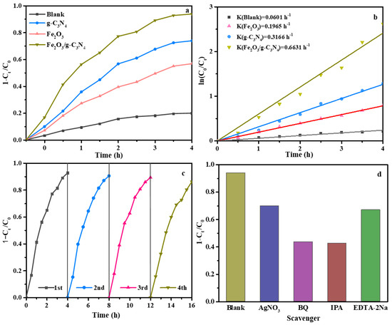 The photocatalytic activities of the synthesized catalysts were assessed through the degradation of NOR under visible light irradiation. The results of the blank experiments in Figure 7a show that low photocatalytic activity was observed in the absence of light, suggesting the NOR degradation is induced by photocatalysis. The degradation efficiency of NOR with the g–C3N4, Fe2O3 and Fe2O3/g–C3N4 catalysts was 74.2%, 56.7% and 94.7%, respectively. These results demonstrate that the photocatalytic activity of the Fe2O3/g–C3N4 composite was enhanced compared to g–C3N4 or Fe2O3. As displayed in the SEM and TEM, the perfect heterojunction interface was formed between g–C3N4 and Fe2O3, resulting in the high transportation and separation of charges and further enhancement of photocatalytic performance.