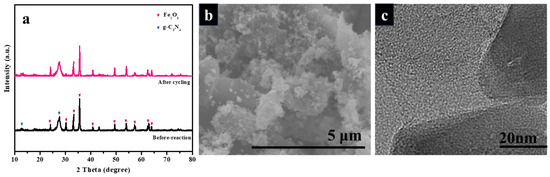 XRD patterns of Fe2O3/g–C3N4 after cycling (a). SEM (b) and TEM (c) images of Fe2O3/g–C3N4 post-reaction.